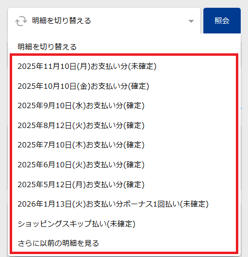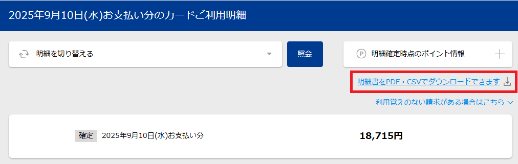 5. 他の月の明細をダウンロードする場合は、画面上部の「明細を切り替える」をクリック